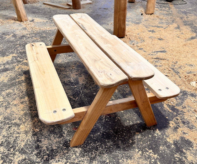 Vollmassive, natürlich und formschöne kleine Picknickbank für Kinder aus dem Stammholz der Robinie.